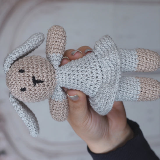 Sweet, simple, and full of charm — this little crochet bunny is sure to hop right into your child’s heart. Standing about 5–6 inches tall, this soft toy is lovingly handcrafted using 100% cotton yarn, making it gentle, safe, and perfect for tiny hands to cuddle.